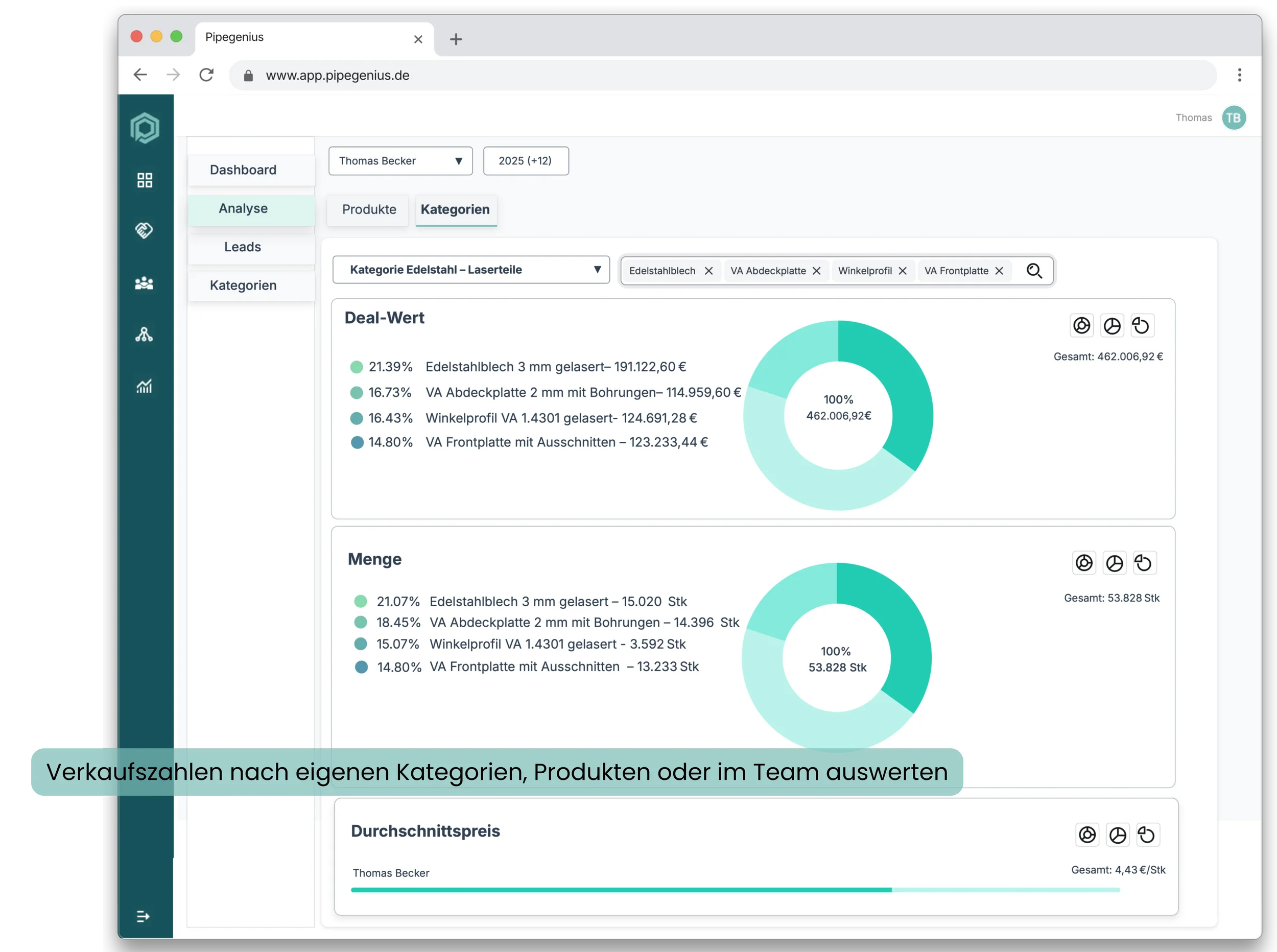 Analysen zeigen dir sofort, wie sich Nachfrage und Preise in deinen Verkäufen entwickeln – direkt in PipeGenius, ohne Exporte oder Zusatztools.