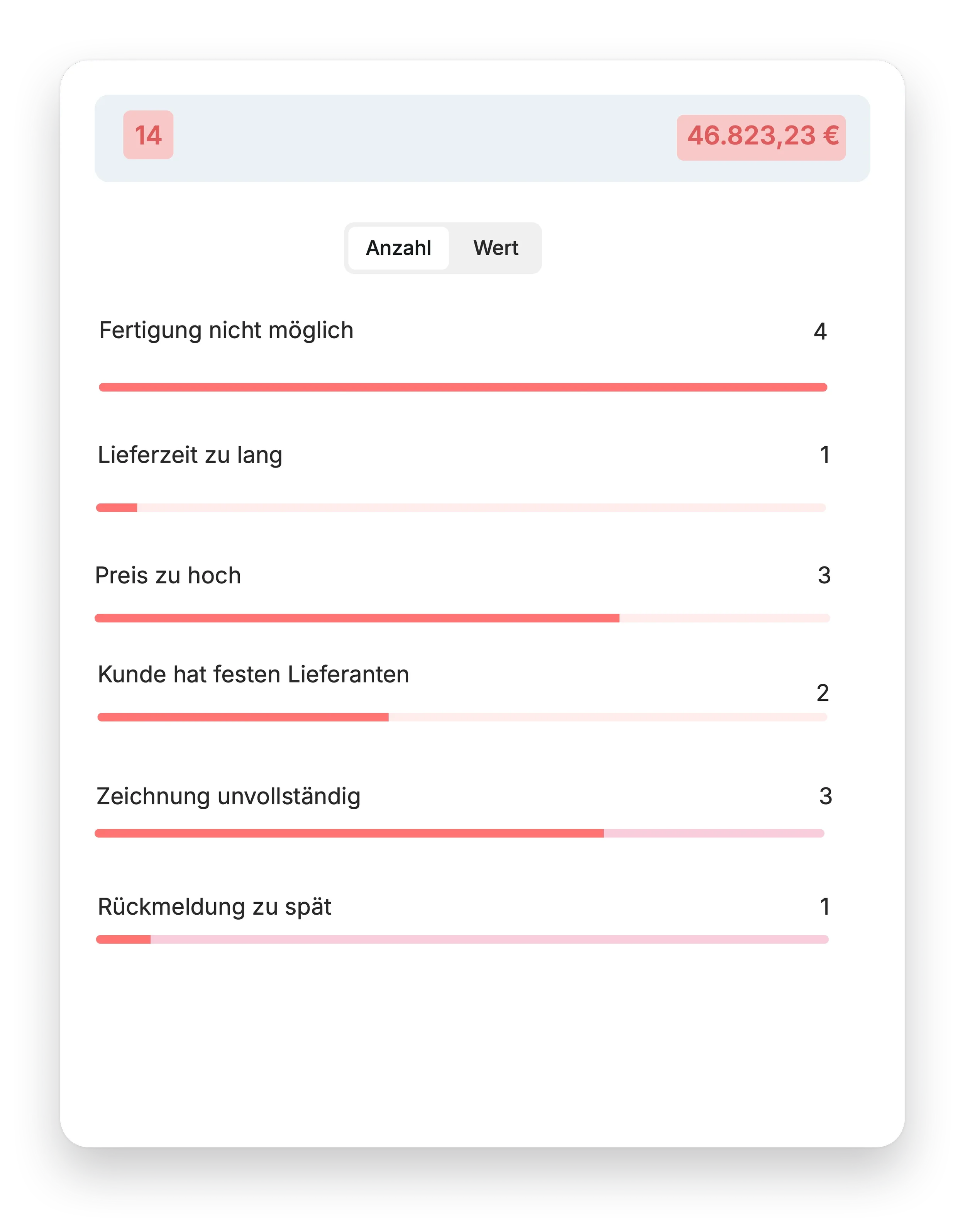 Bei jedem verlorenen Angebot zeigt PipeGenius den Grund. Muster werden sichtbar – pro Kunde oder im gesamten Vertrieb.