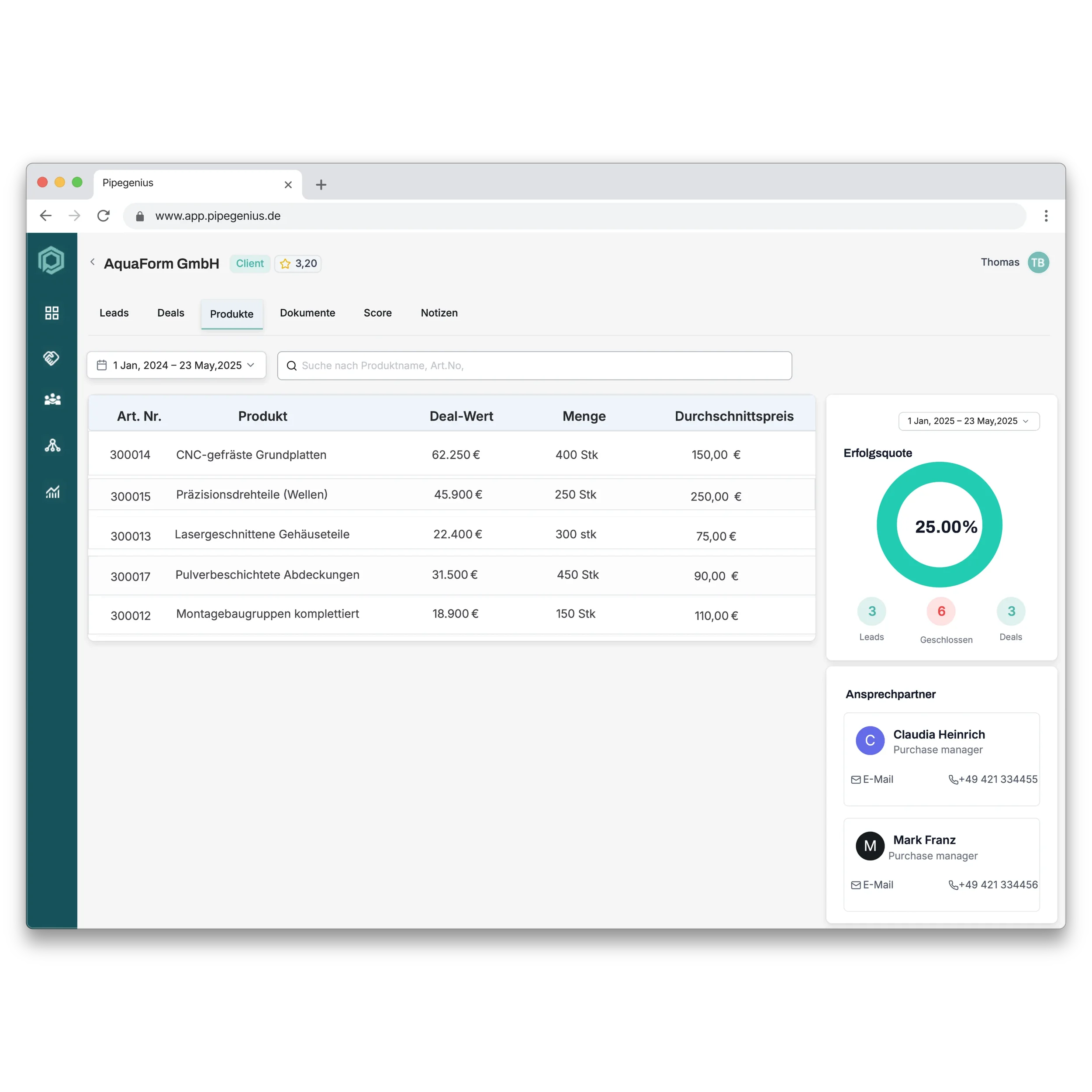 PipeGenius zeigt dir Kaufhistorie, Mengen, Preise und Erfolgsquoten in einer Übersicht. So erstellst du Angebote, die passen – konsistent, fundiert und ohne Rätselraten.