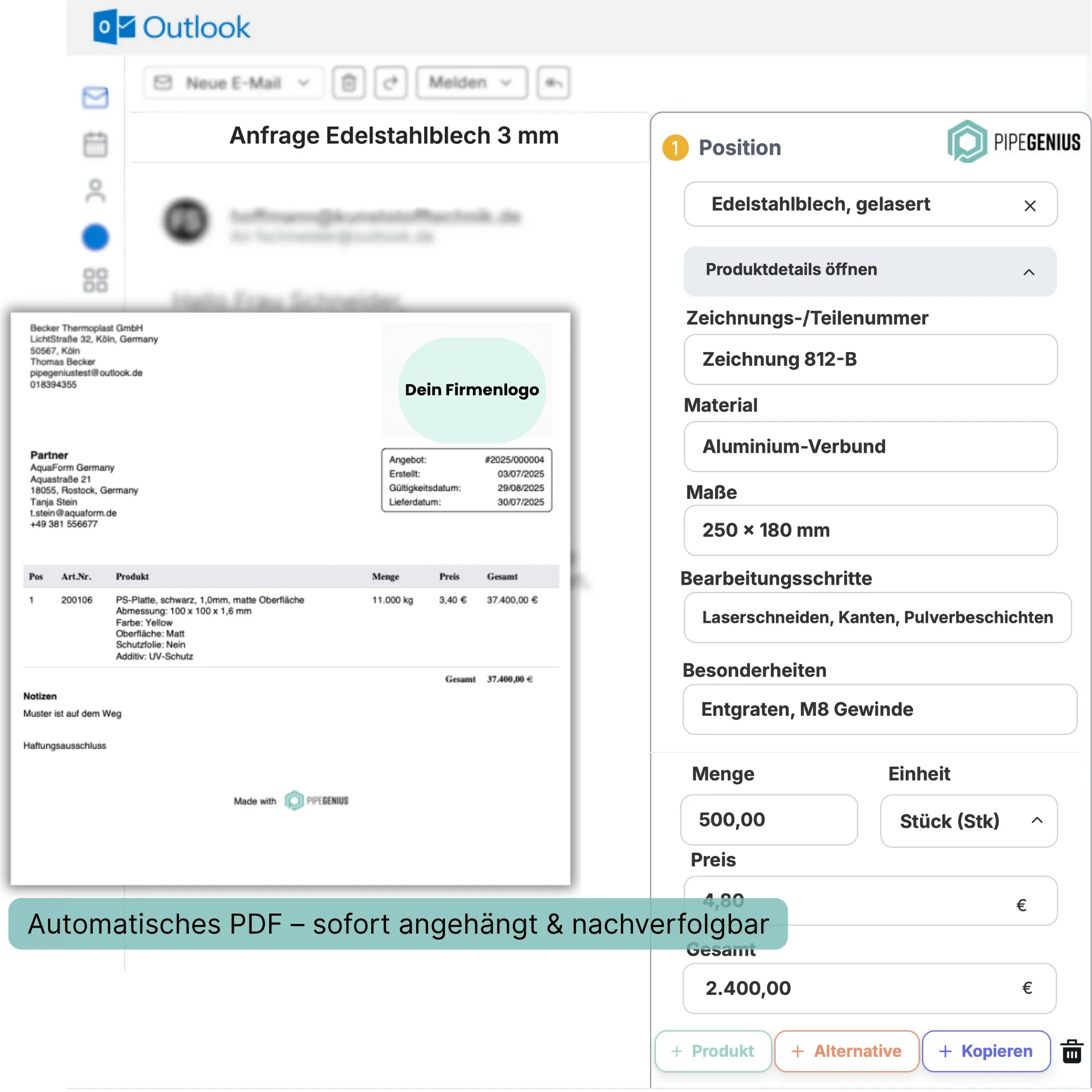 Aus Outlook direkt als PDF mit allen Details – von Stücklisten über Varianten bis zu Staffelpreisen und Alternativen.