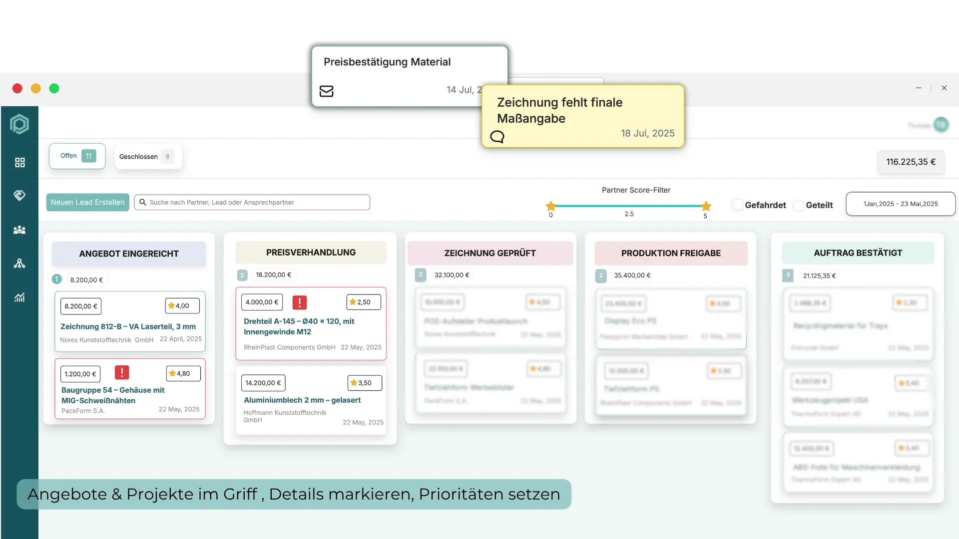 Alle Angebote, Aufträge, Zeichnungen und Kundenanforderungen an einem Ort.