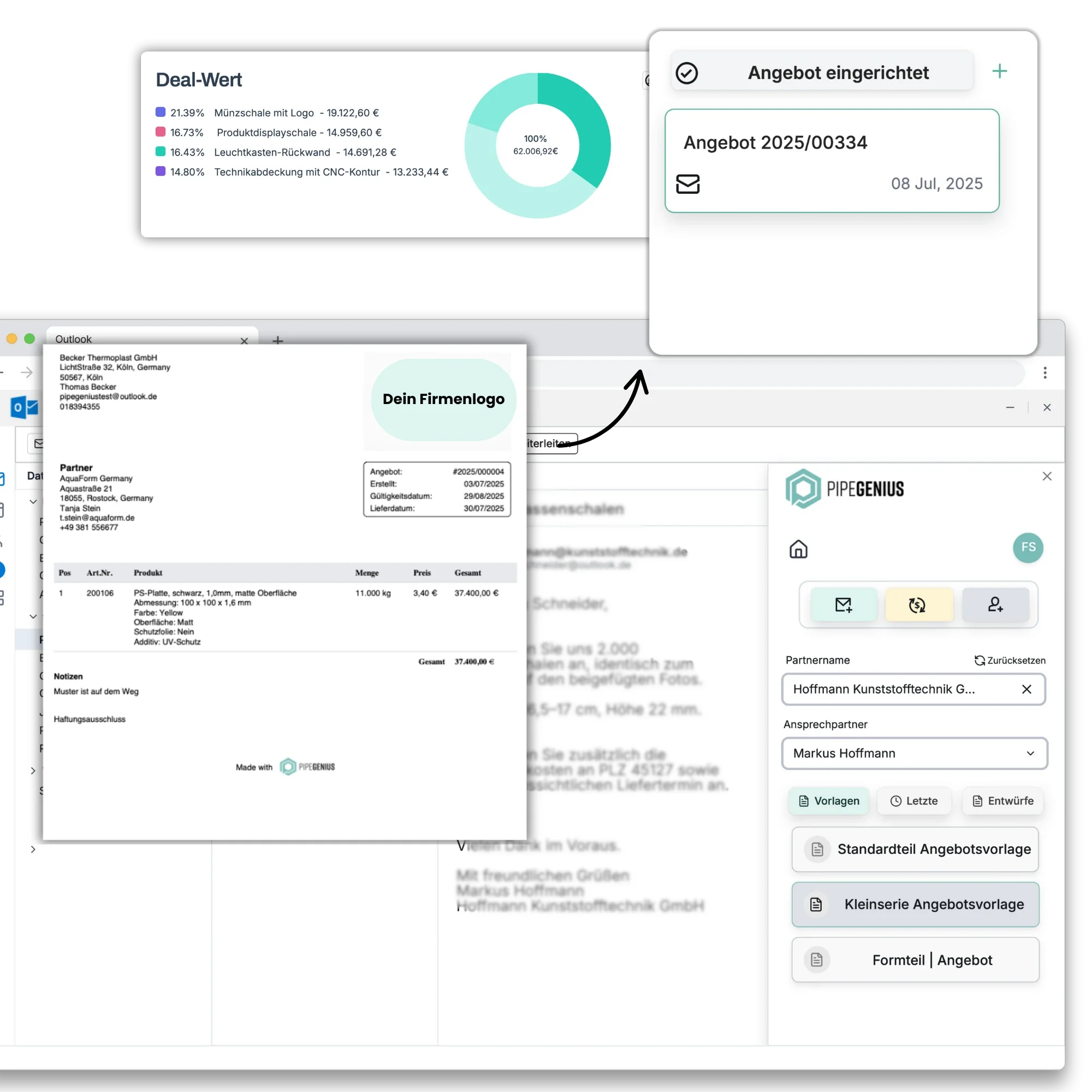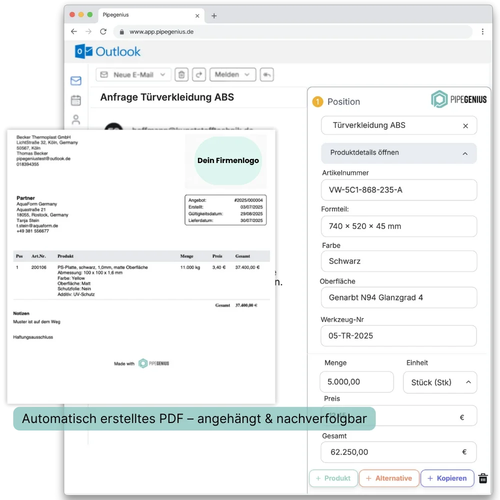 Aus Outlook direkt als PDF mit allen Details, Werkzeugkosten, Stückpreise, Staffelpreise und Materialalternativen.