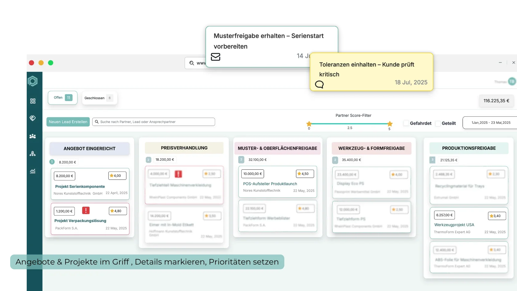PipeGenius zeigt dir sofort, wo Handlungsbedarf besteht. Angebote und Projekte stehen mit klaren Prioritäten in der Pipeline – automatisch sortiert.