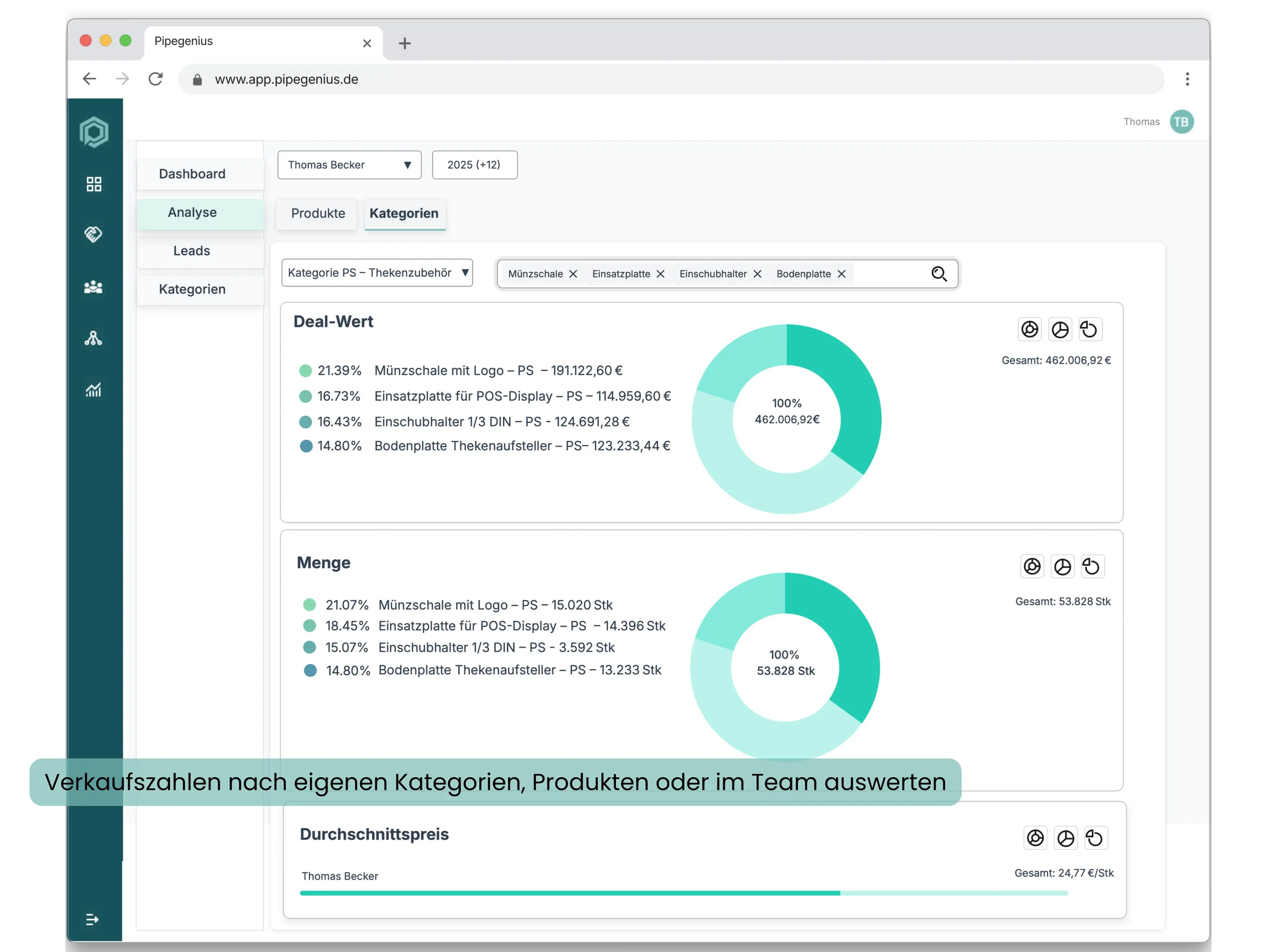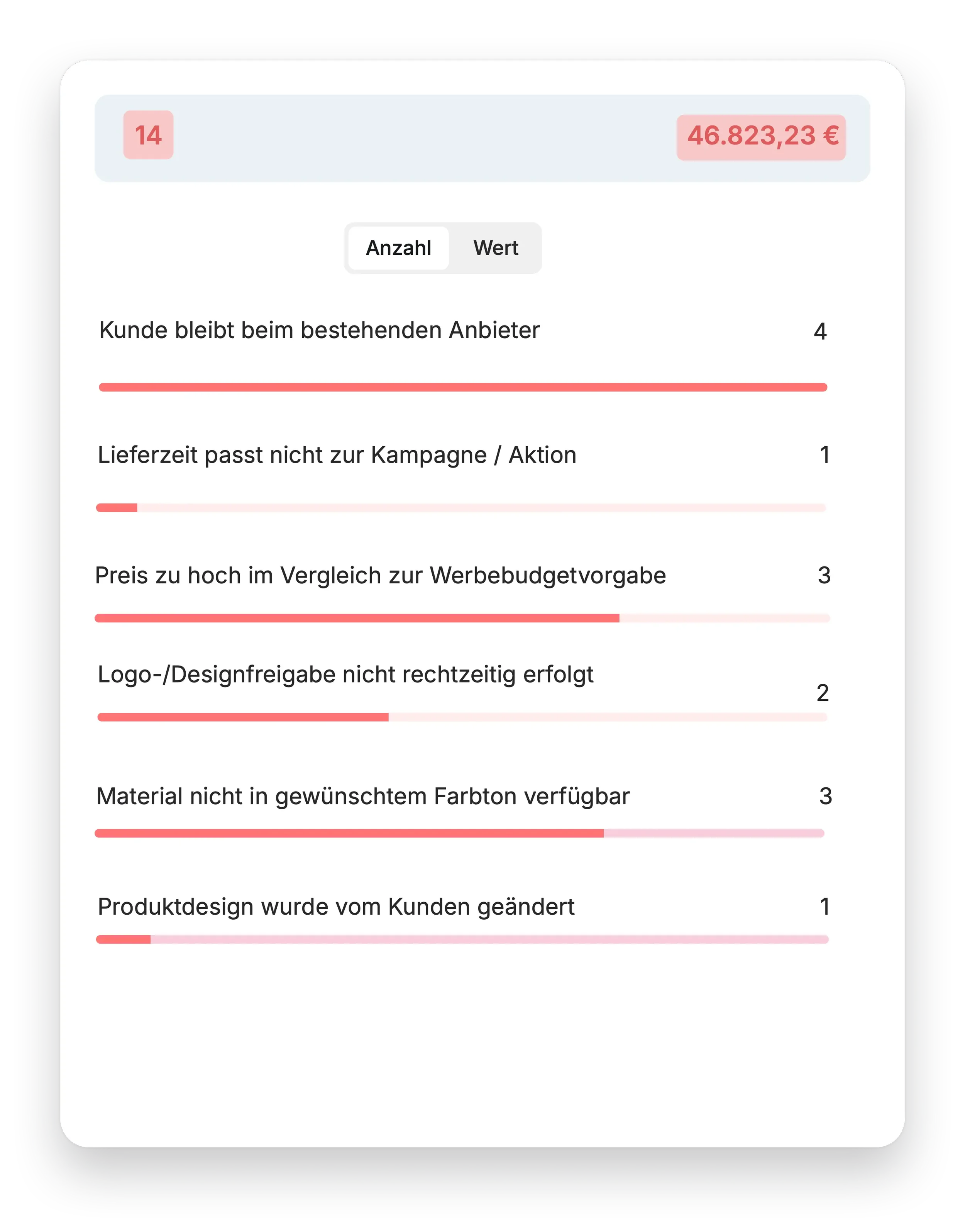 Bei jedem verlorenen Angebot zeigt PipeGenius den Grund. Muster werden sichtbar – pro Kunde oder im gesamten Vertrieb.
