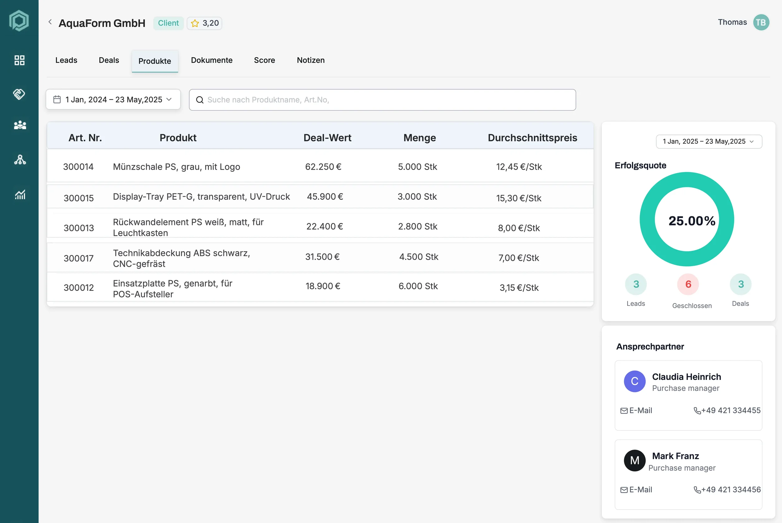 PipeGenius zeigt dir Kaufhistorie, Mengen, Preise und Erfolgsquoten in einer Übersicht. So erstellst du Angebote, die passen – konsistent, fundiert und ohne Rätselraten.