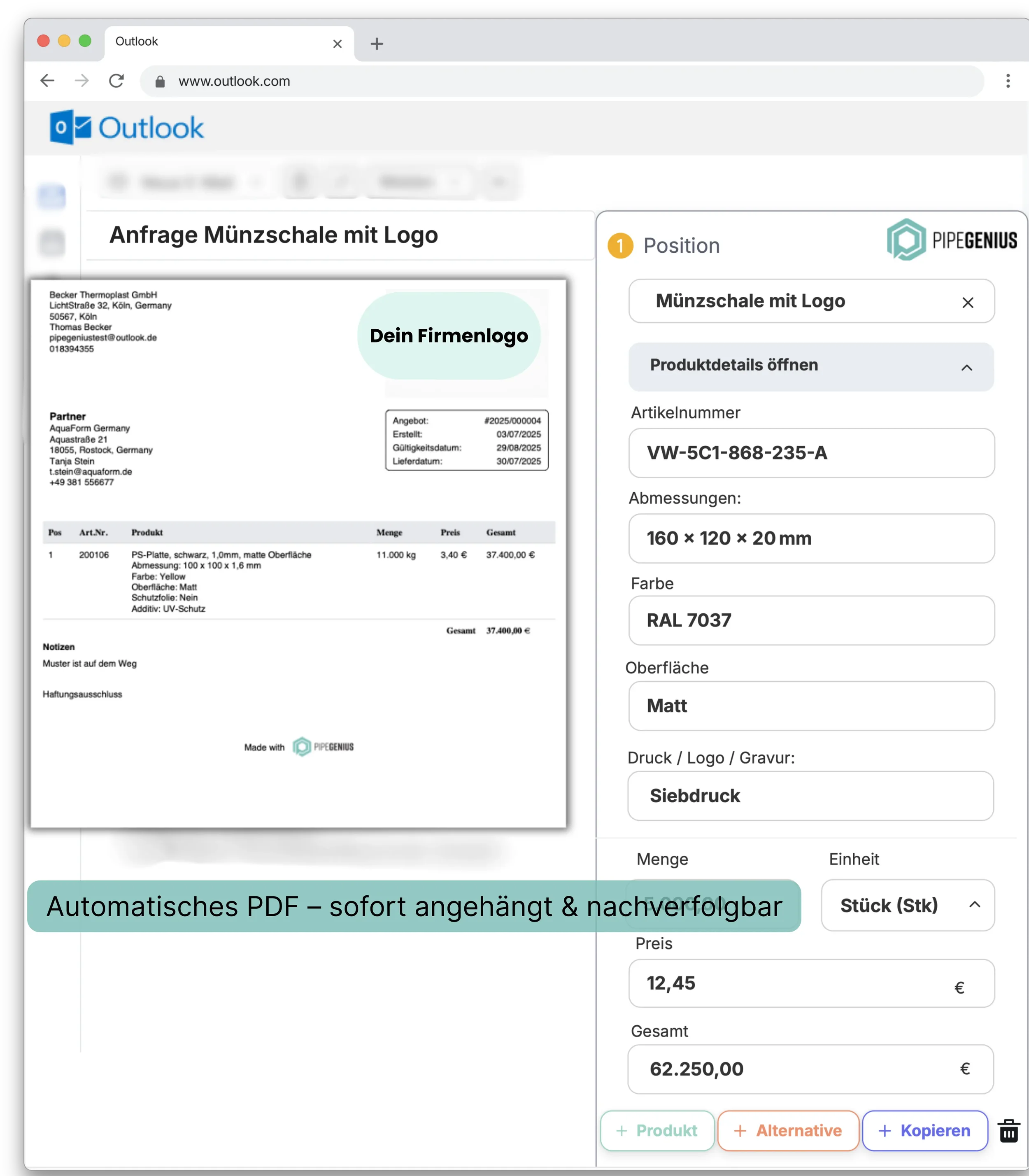Aus Outlook direkt als PDF mit allen Details – von Materialvarianten bis Branding-Optionen, inklusive Staffelpreisen und Alternativen.