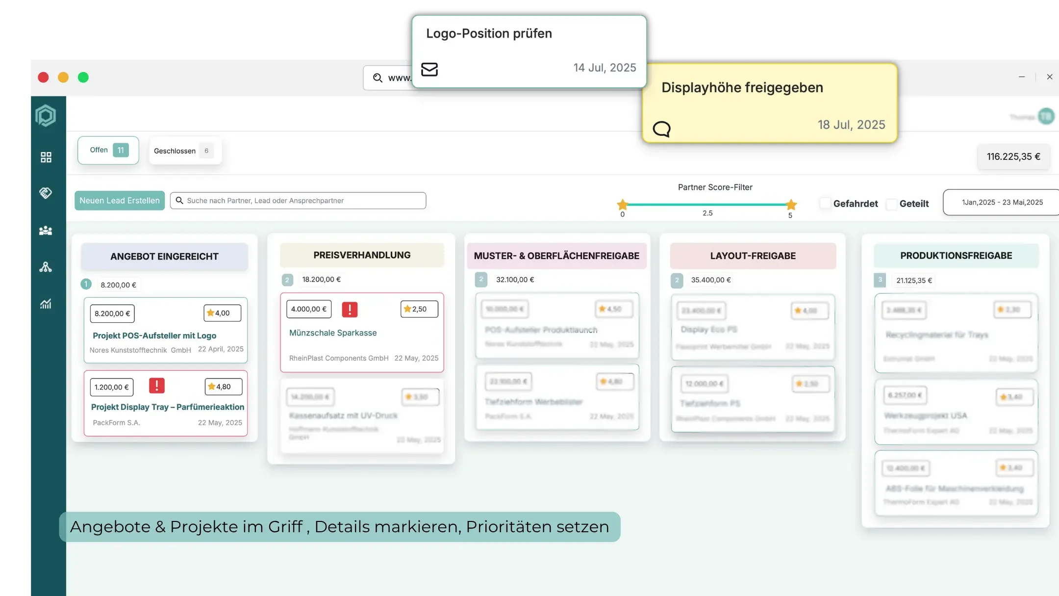 PipeGenius zeigt dir sofort, wo Handlungsbedarf besteht. Angebote und Projekte stehen mit klaren Prioritäten in der Pipeline – automatisch sortiert.
