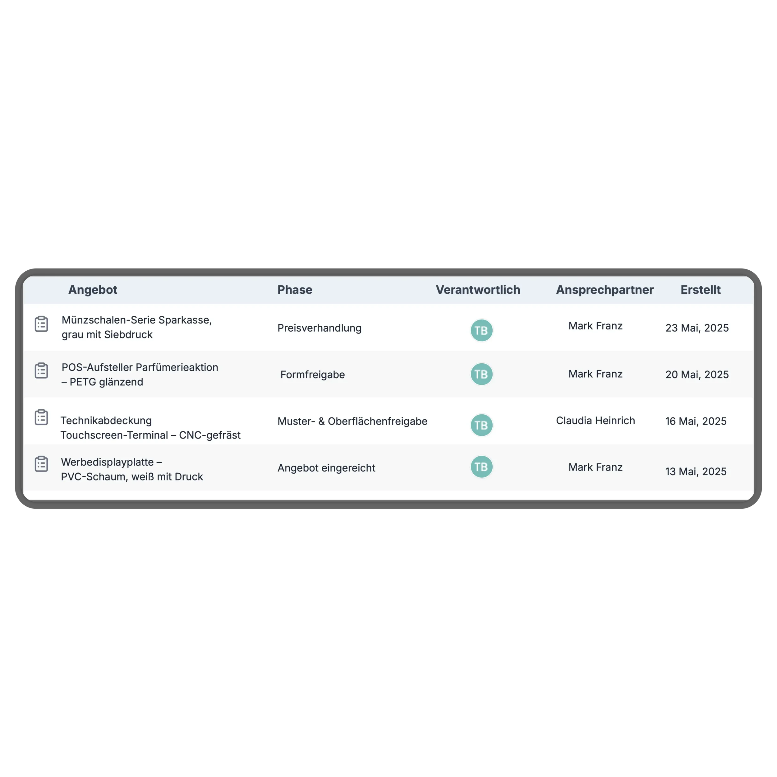 Alle Angebote, Aufträge, Freigaben und Branding-Varianten an einem Ort.